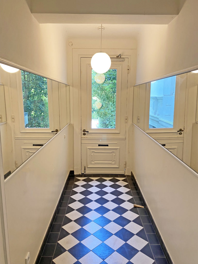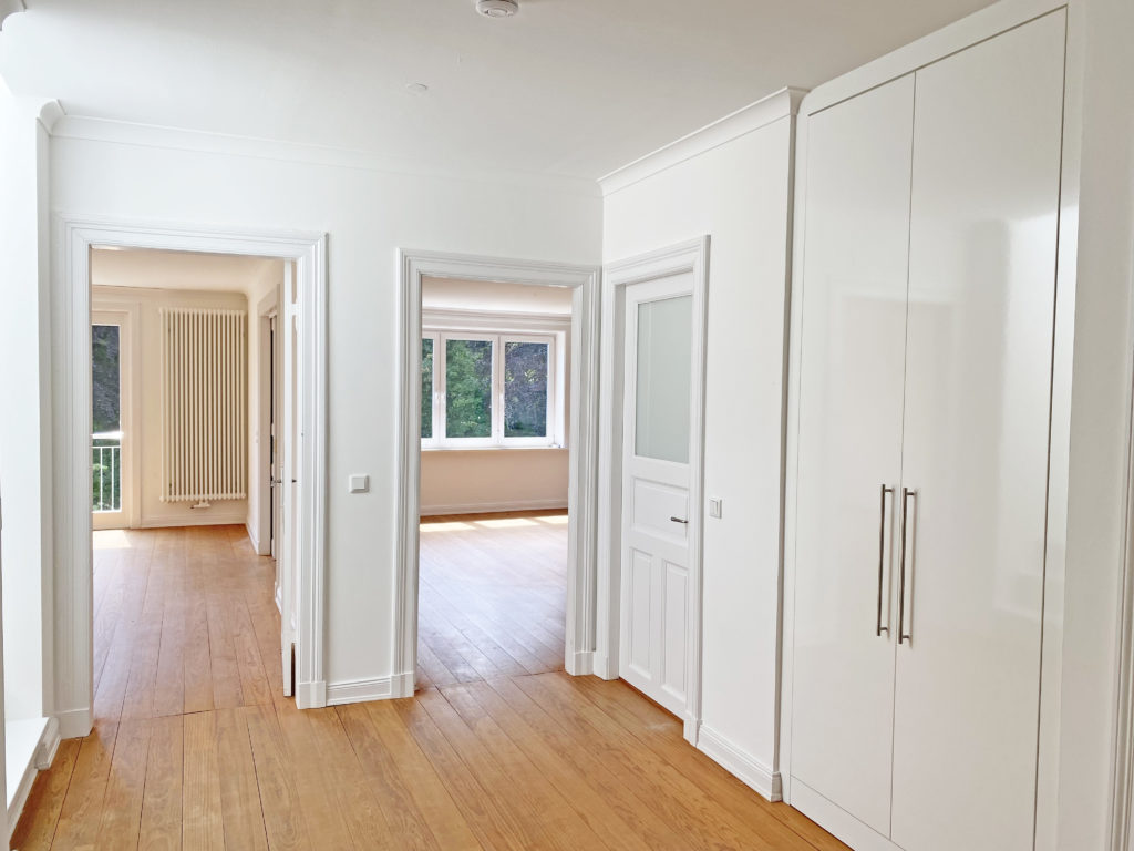 Ausgestattet ist die Wohnung mit einem originalen Hamburger Dielenboden und Fußleisten. Die ebenfalls originalen Zimmertüren und – rahmen wurden hochwertig aufgearbeitet und mit modernen Beschlägen versehen. Das Wannen- sowie das separate Duschbad wurden ähnlich wie in der Erdgeschosswohnung in einem zeitlosen und eleganten weiß/grau gehalten.