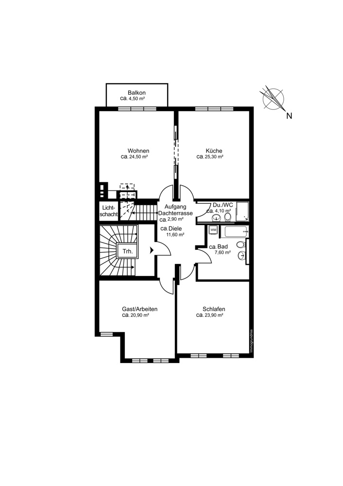 ca. 147 m² (inkl. ¼ Balkonfläche, inkl. ½ Dachterrassenfläche)